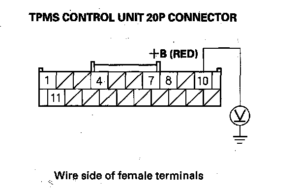 7. Measure voltage between body ground and TPMS control unit 20P connector terminal No. 10.