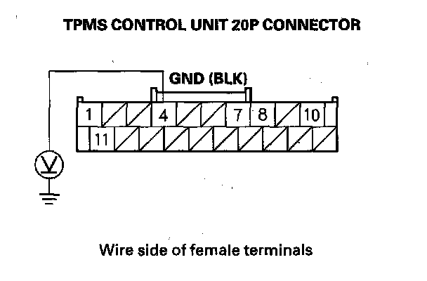 9. Measure voltage between body ground and TPMS control unit 20P connector terminal No. 8.
