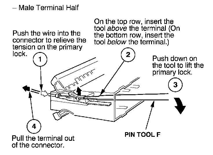 Before you begin, inspect the wire you are about to repair for damage and length. Make sure the wire will be long enough to make a terminal repair without stretching it when you reinstall the terminal in the connector. If the wire is too short, or if access to the connector is too restricted to make a terminal repair, you may need to install a pigtail terminal (a short length of wire with a factory-crimped terminal on it).