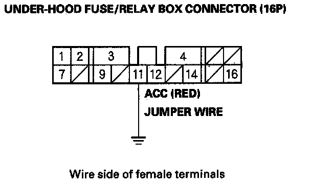 9. Momentarily connect under-hood fuse/relay box 16P connector terminal No. 11 to body ground with a jumper wire several times.