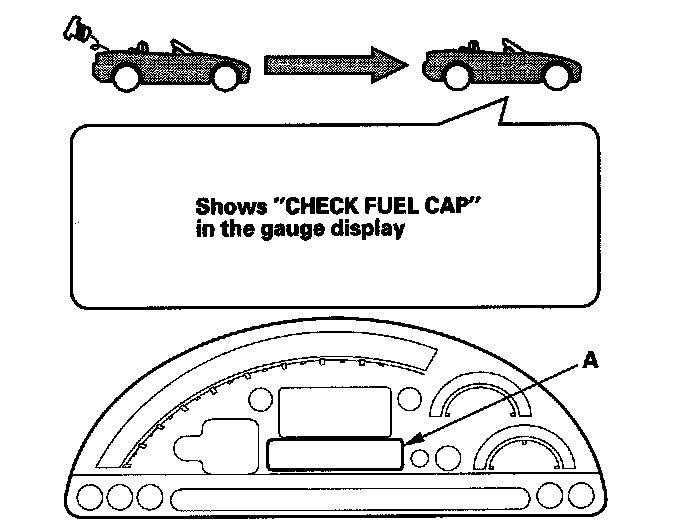 The first time a leak is detected a "CHECK FUEL CAP" message appears in the gauge display (A). To scroll to another message, press the select/reset button. The "CHECK FUEL CAP" message will appear each time you restart the engine until the system turns the message off. Turn the engine off then replace or tighten the fuel fill cap until it clicks at least once.