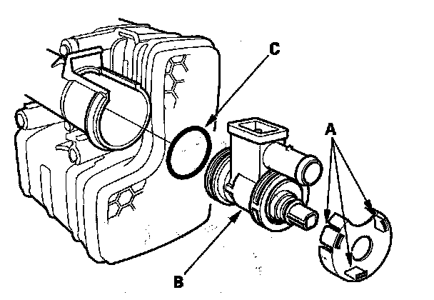2. Pry the lock tabs (A) outward, and remove the EVAP canister vent shut valve (B).