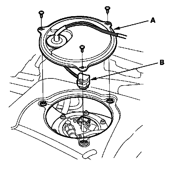 7. Remove the access panel (A) from the floor, and disconnect the fuel tank unit 5P connector (B).