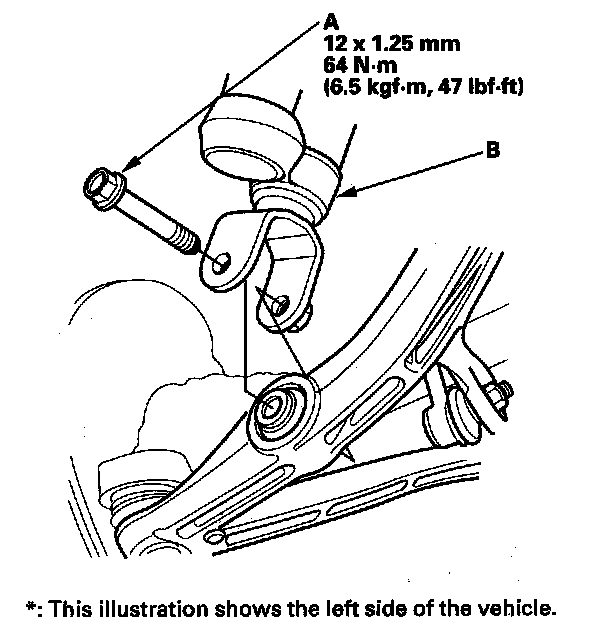 23. Place a jack or other support under the rear suspension subframe (A). Remove the mounting bolts (B) and the rear suspension subframe (A).