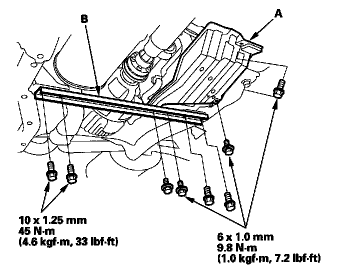 17. Remove the canister cover (A) and the rear suspension stiffener (B).