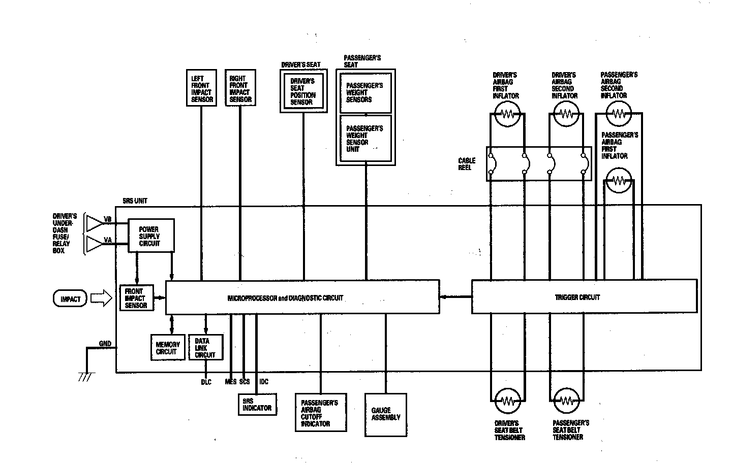The main circuit in the SRS unit senses and judges the force of impact and, if necessary, ignites the inflator charges. If battery voltage is too low or power is disconnected due to the impact, the voltage regulator and the back-up power circuit will keep voltage at a constant level.