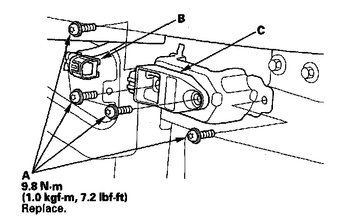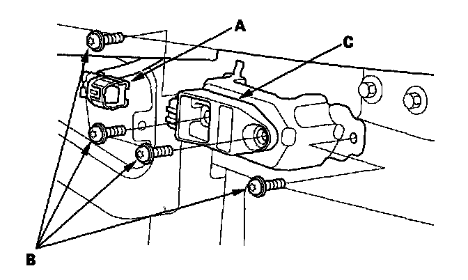 4. Disconnect the engine compartment wire harness 2P connector (A), and using a TORX T30 bit, remove the TORX bolts (B), then remove the front impact sensor (C).