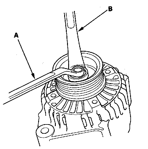 3. If the front bearing needs replacing, remove the pulley locknut with a 10 mm wrench (A) and a 22 mm wrench (B). If necessary, use an impact wrench.