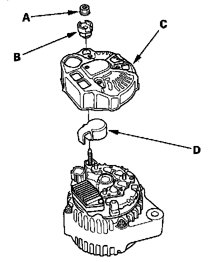 5. Remove the washer nut (A) and terminal insulator (B) from the B terminal, then remove the end cover (C) and brush holder insulator (D).