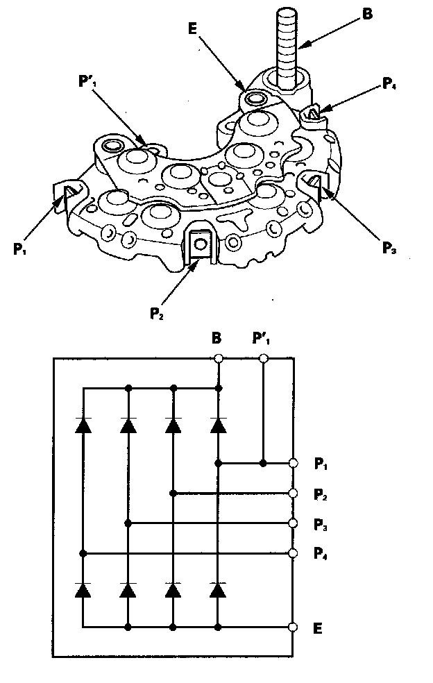 18. Check for continuity in each direction, between the B terminal and P terminals, and between the E terminal and P terminals of each diode pair. All diodes should have continuity in only one direction. Because the rectifier diodes are designed to allow current to pass in one direction, and the rectifier is made up of eight diodes (four pairs), you must test each diode in both directions for continuity with an ohmmeter that has diode checking capability: a total of 16 checks.