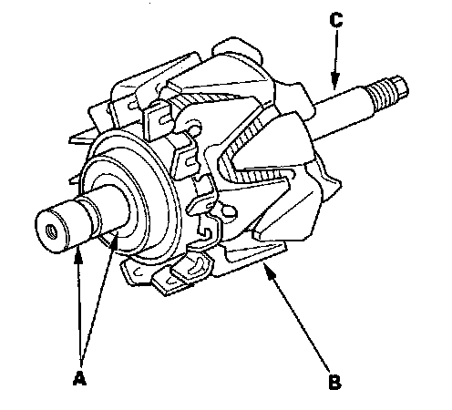 21. Then check for continuity between each slip ring and the rotor (B) and the rotor shaft (C).