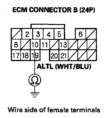 14. Check for continuity between ECM connector terminal B10 and body ground.