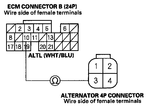 27. Check for continuity between ECM connector terminal B10 and alternator 4P connector terminal No. 3.
