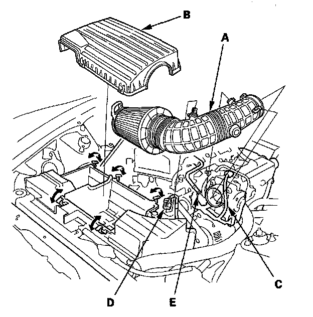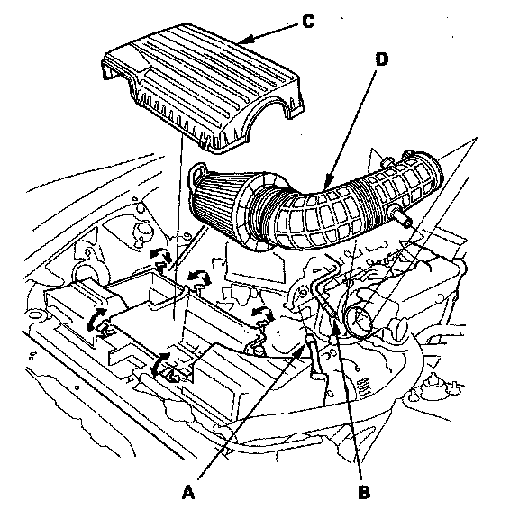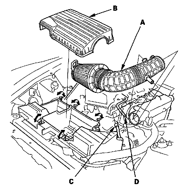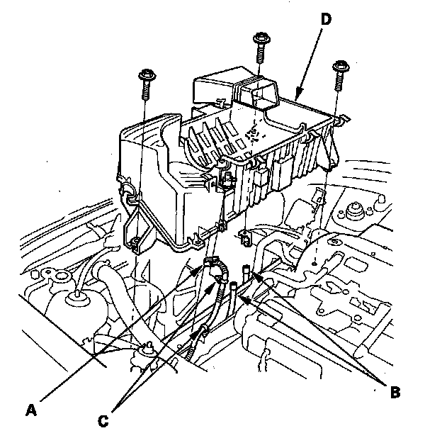 5. '00-05 models: Disconnect the air control solenoid valve connector (A) and vacuum hoses (B), remove the harness clamps (C), then remove the intake air cleaner housing (D).