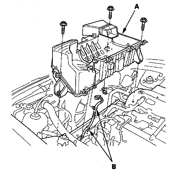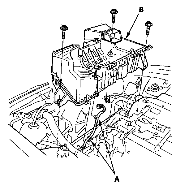 6. '06-08 models: Remove the IAT sensor harness clamps (A), then remove the intake air cleaner housing (B).