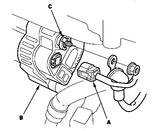 8. Disconnect the 4P connector (A) from the alternator (B), and disconnect the BLK wire from the alternator B terminal (C).