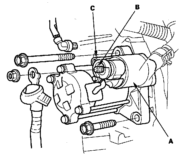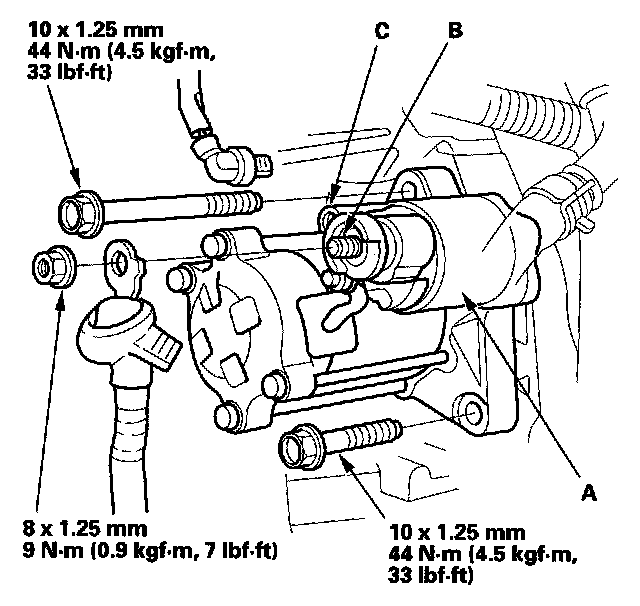 1. Install the starter, then connect the starter cable to the B terminal on the starter solenoid (A) and the BLK/WHT wire to S terminal (C). Make sure the crimped side of the starter cable ring terminal faces away from the starter when you connect it.
