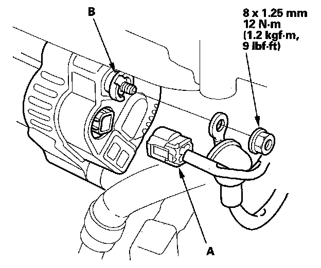 3. Connect the 4P connector (A) to the alternator and BLK wire to the alternator B terminal (B).