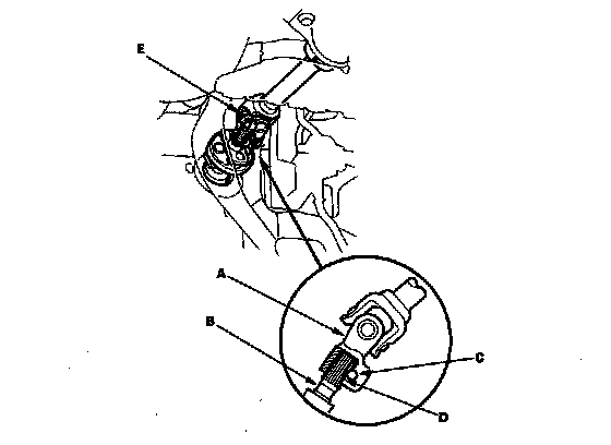 3. Pull on the steering joint to make sure that the steering joint is fully seated, but do not pull excessively on the joint. Then install the steering joint bolt (E) and tighten it to the specified torque.