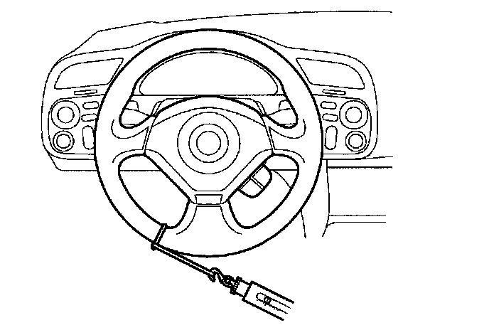 2. Attach a commercially available spring scale to the steering wheel. With the engine idling and the vehicle on a clean, dry floor, pull the scale as shown and read it as soon as the tires begin to turn.