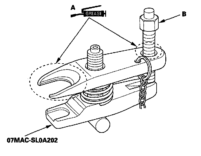 2. Apply grease to the ball joint remover on the areas shown (A). This will ease installation of the tool and prevent damage to the pressure bolt (B) threads.