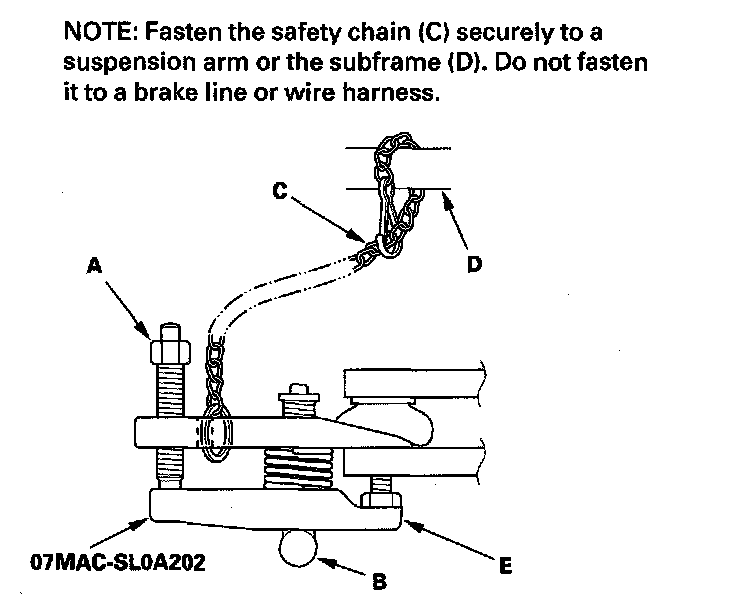 4. After adjusting the adjusting bolt, make sure the head of the adjusting bolt is in the position shown to allow the jaw (E) to pivot.
