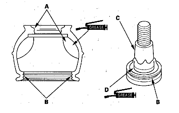 3. Wipe the grease off the tapered section of the ball joint pin (C), and pack the base (D) with fresh grease.