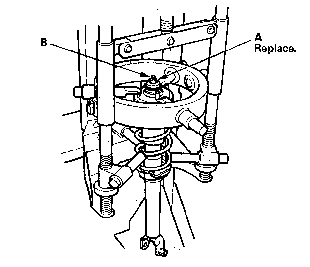 1. Compress the damper spring, then remove the self-locking nut (A) while holding the damper shaft (B) with a hex wrench. Do not compress the spring more than necessary to remove the nut.