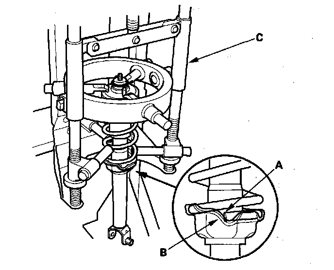 2. Install the damper assembly on a commercially available strut spring compressor (C).