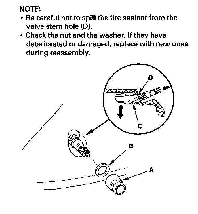 4. Remove the valve stem nut (A) and washer (B), then push the tire pressure sensor (C) into the wheel, down into the tire.