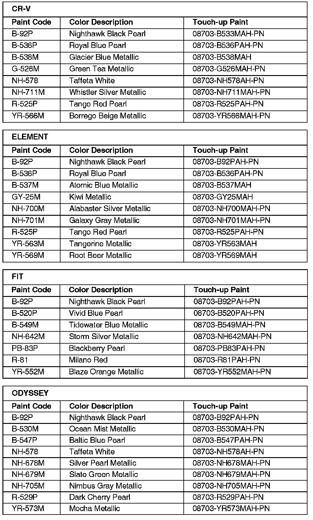 2008 Honda Paint Codes