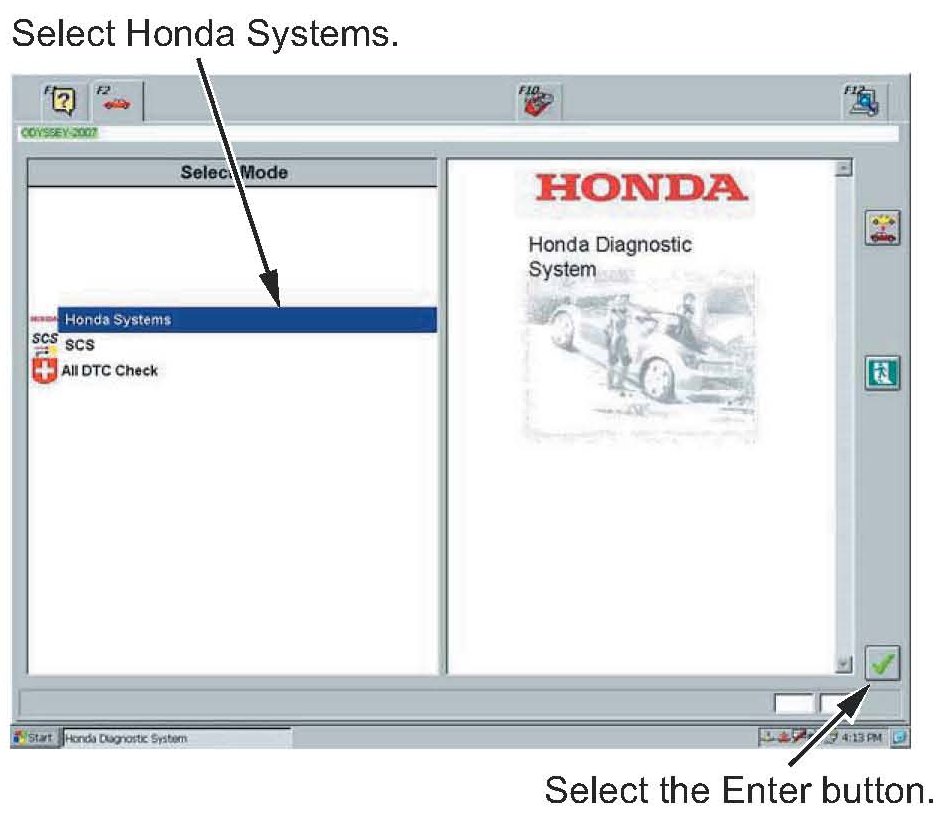 6. In the Select Mode menu, select Honda Systems, then select the Enter button.