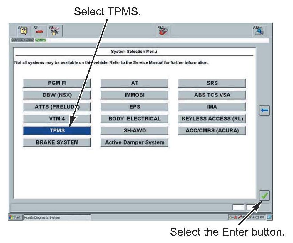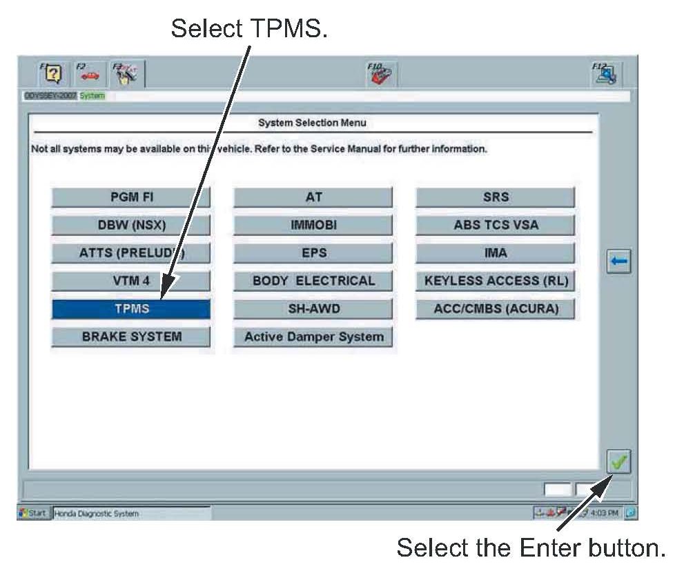 7. In the System Selection Menu, select TPMS, then select the Enter button.
