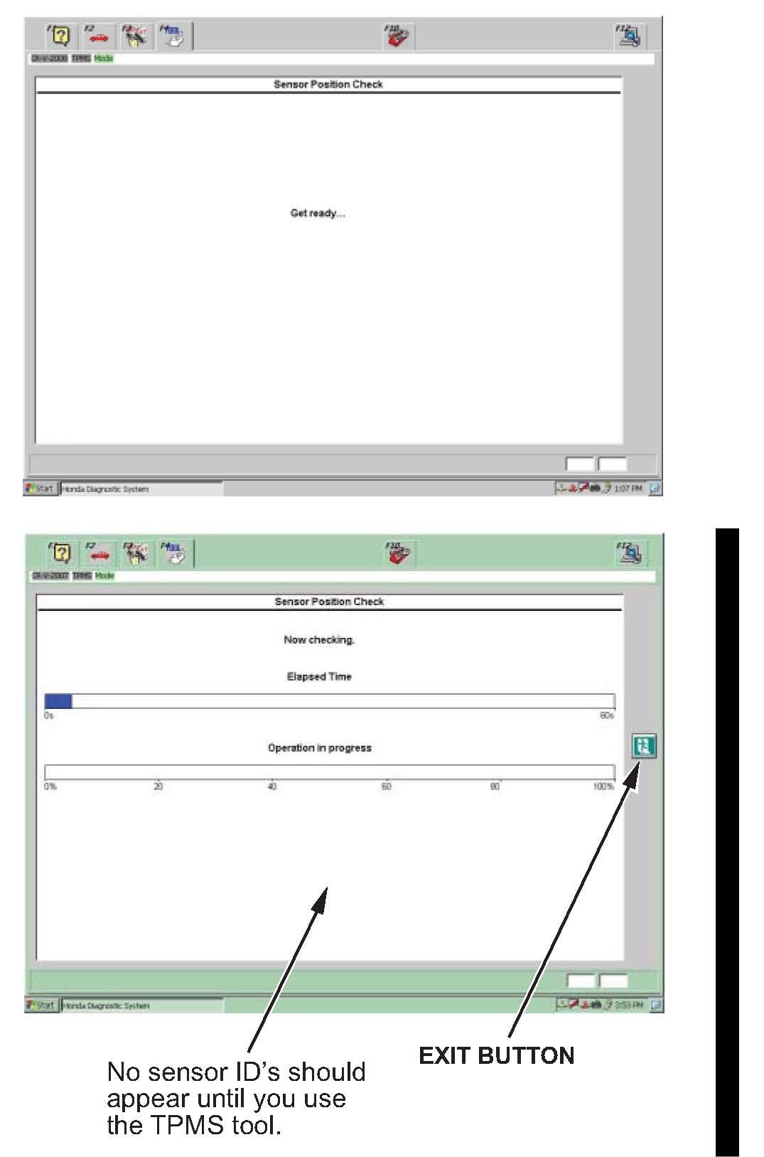 ^ If the sensor IDs appear without the TPMS sensor tool button being pushed, a TPMS sensor is transmitting. Select the Exit button, wait 5 minutes for the sensor to go to sleep, then follow the on-screen prompts.