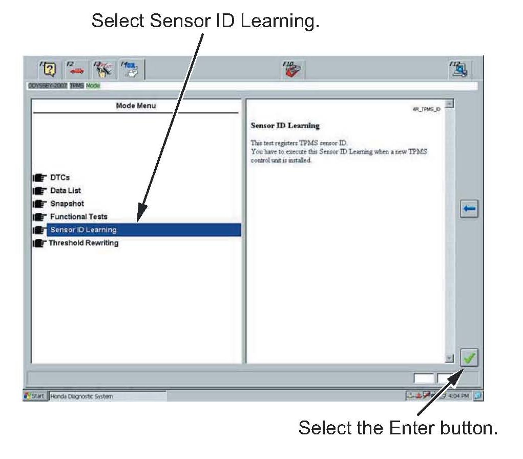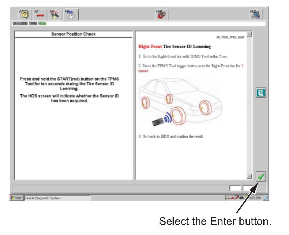 9. In the TPMS Sensor ID Learning screen, select the Enter button.