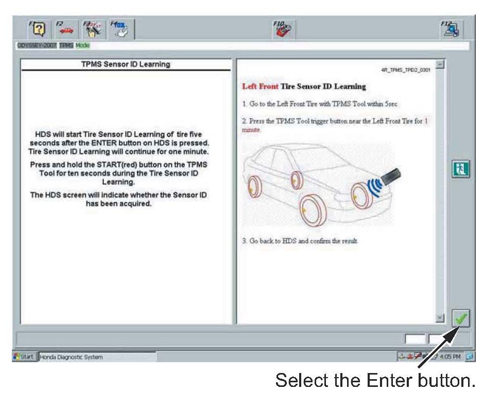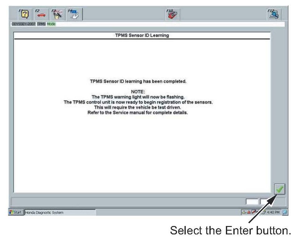 22. The sensor ID learning procedure is complete. Select the Enter button to continue to register the TPMS sensor IDs in the TPMS unit.