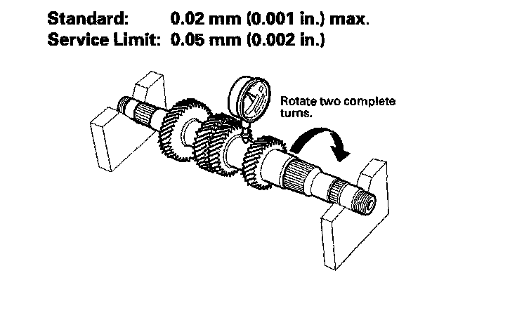3. Inspect for runout by supporting both ends of countershaft. Then rotate the countershaft two complete turns while measuring with a dial gauge. If the runout is more than the service limit, replace the countershaft.