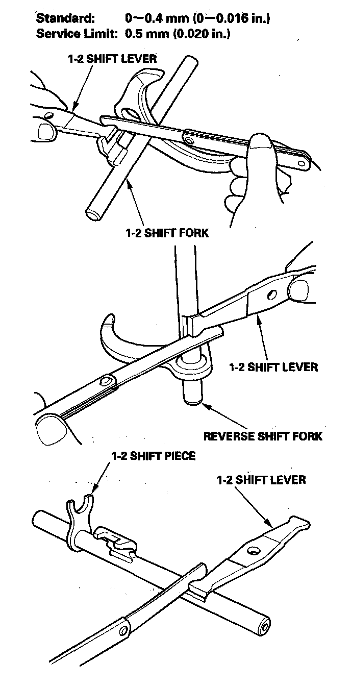 5. Measure the clearance between the 1-2 shift lever and each shift fork and shift piece. If the clearance exceeds the service limit, go to step 6.
