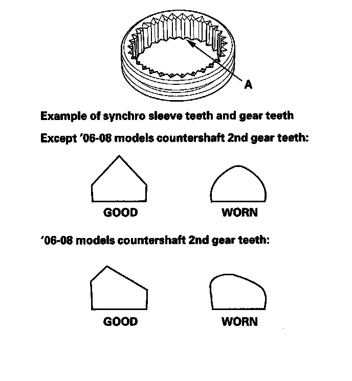 2. Inspect the teeth (A) on each synchro sleeve and matching teeth on each gear for wear (rounded off).