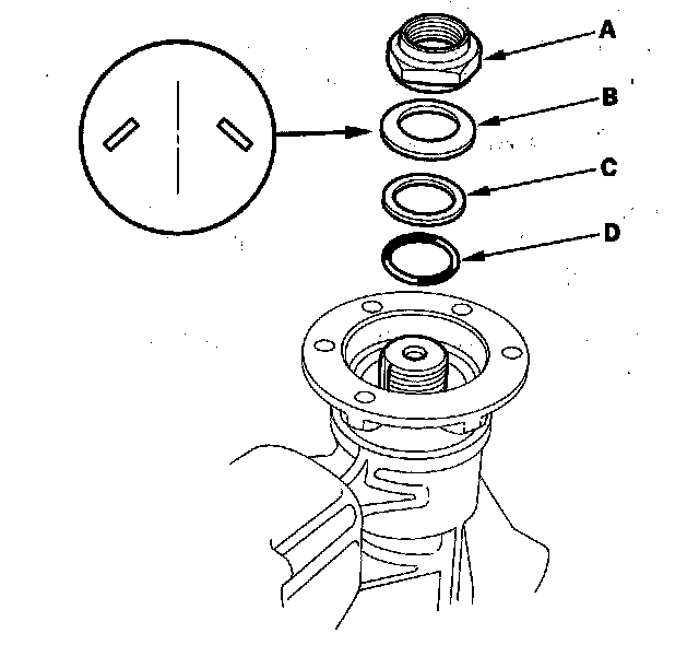 8. Remove the 27 mm locknut (A), the spring washer (B), the back-up ring (C), and the O-ring (D).