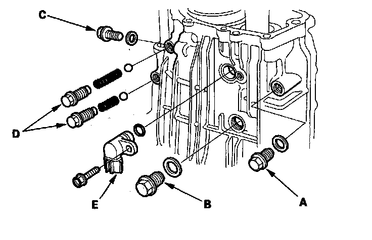 8. Remove the drain plug (A), the filler plug (B), the 12 mm drain plug (C), washers, the set screws (D), springs, steel balls, and the vehicle speed sensor (VSS) ('00-05 models) or the output shaft (countershaft) speed sensor ('06-08 models) (E).