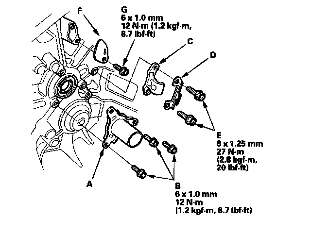 2. Install the release bearing guide (A) with three bolts (B), the clutch release hanger (C), the release hanger spring (D) with two bolts (E), and the breather plate (F) with a bolt (G).