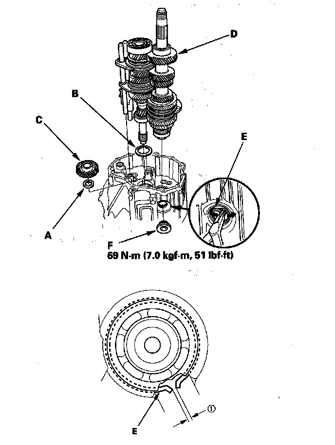 4. Install the reverse idler gear (C), mainshaft, countershaft, and the shift forks assembly (D) with the snap ring pliers, and set the 68 mm snap ring (E) into the groove of the countershaft bearing.