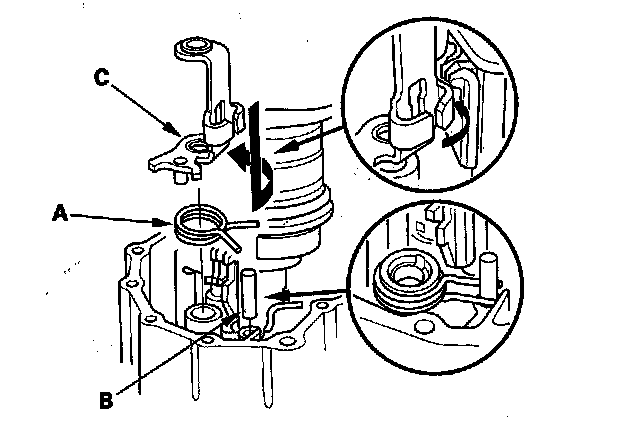 7. Install the select return spring (A) and the 8 x 40 pin (B) onto the clutch housing, then install the interlock (C).