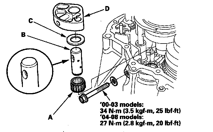 25. Install the oil pump inner and outer rotors (A), the steel ball (B), the spring (C), and the oil pump plate (D).