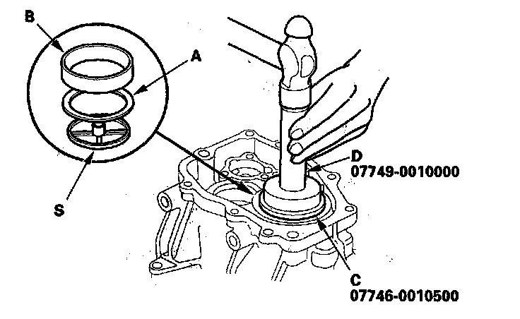 17. Install oil guide plate S, and the 68 mm shim (A), then install the bearing outer race, (B) using the 62 x 68 mm attachment (C) and driver (D) as shown.