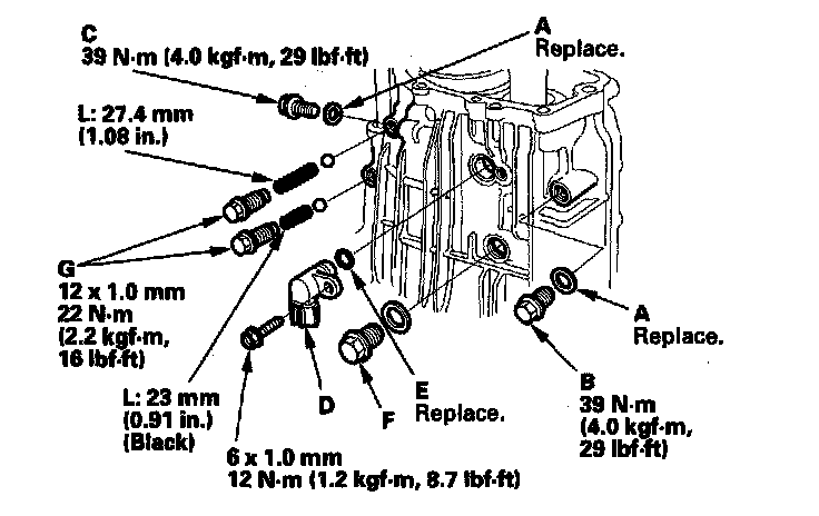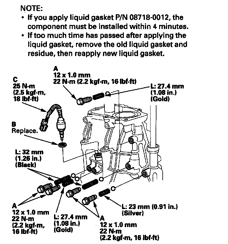5. Apply liquid gasket, P/N 08718-0001, evenly to the mating surface of the threads of the 34 mm sealing bolt (F) and the transmission housing. Install the component within 5 minutes of applying the liquid gasket.