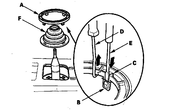 6. Remove the boot holder (A) by releasing the lock tabs (B) indicated by the arrowheads (C). Insert a hook-shaped tool (D) underneath the boot holder, and lift slightly while releasing the lock tabs with a flat-tip screwdriver (E).