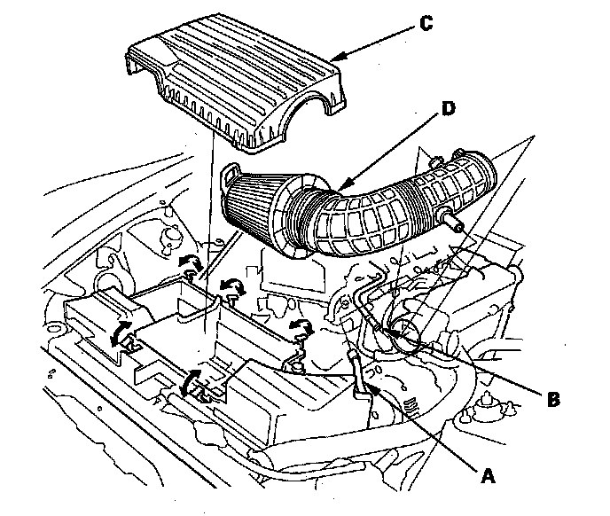 9. '00-05 models: Disconnect the air hose (A) and breather pipe (B), then remove the air cleaner housing cover (C) and air cleaner element assembly (D).
