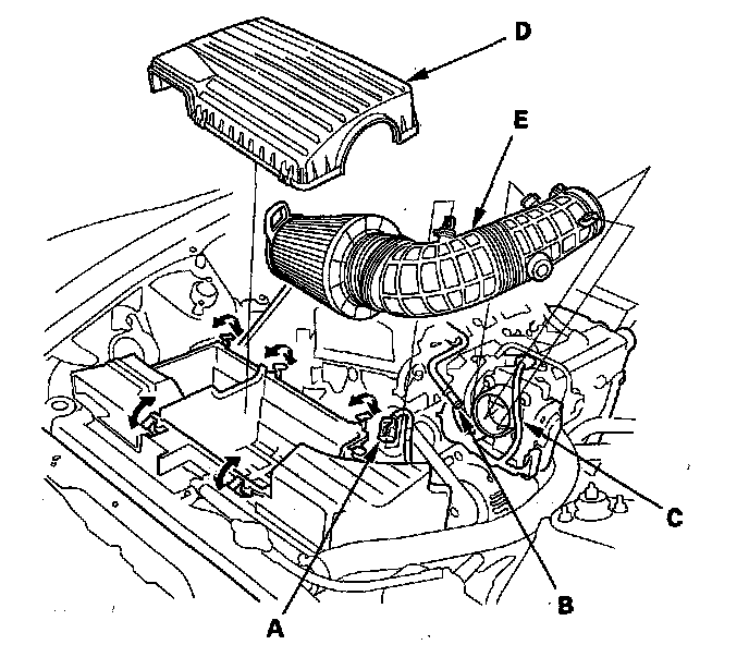 10. '00-05 models: Disconnect the air control valve vacuum control solenoid valve connector (A) and vacuum hoses (B), then remove the air cleaner housing (C).